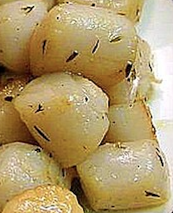 Faites ensuite rissoler vos pétoncles, environ quatre par personne, cinq si vous voulez être généreux, toujours dans le même beurre et dans une poêle assez chaude. En même temps, faites revenir un ou deux oignons verts avec ces dites noix de Saint-Jacques. Déglacez ceci avec une eau-de vie de poire, telle que celle produite par la Distillerie de Québec, produit disponible à la Société des Alcools du Québec. N’exagérez point: ne mettez qu’environ deux cuillerées à soupe maximum de cette eau de vie. Si vous préférez donner un côté un peu plus sucré au plat, déglacez plutôt avec un poiré de glace tel que celui du Domaine des Salamandres, à Hemmingford, en Montérégie, spécialistes de la poire; particulièrement leur Poiré de glace cuvée limitée, élevée en fûts de chêne.