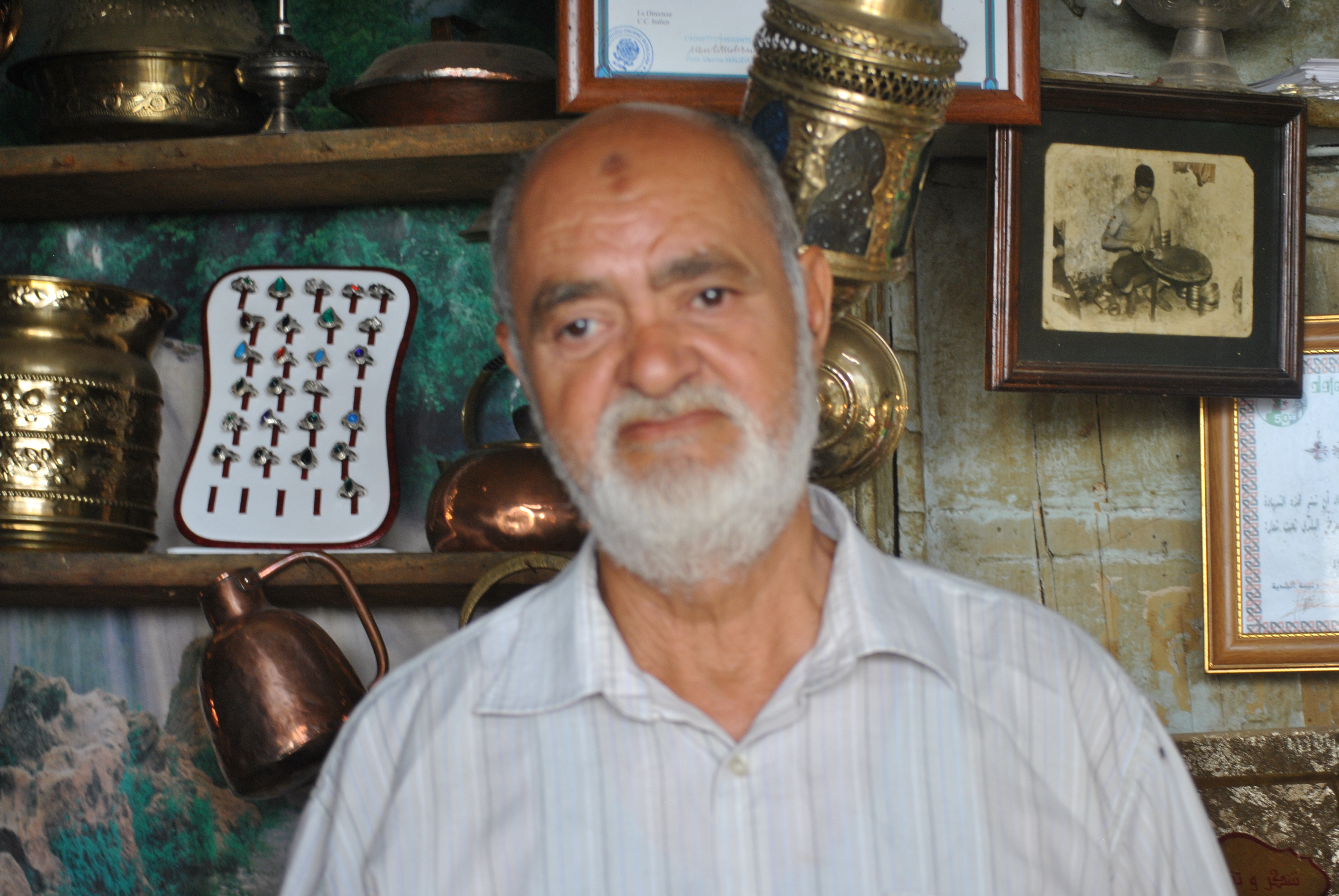 Hadj El Hachemi Benmira est le plus ancien dinandier de la casbah d'Alger. Il y travaille le cuivre depuis 1958. Quand je passe devant son atelier qui brille d'œuvres, il y est caché au fond, accroupi sur un petit tabouret et martèle une pièce de cuivre pour entailler des motifs de style oriental. Il se laisse déranger aisément et nous accueille très chaleureusement comme il est coutume de le faire au Maghreb.
