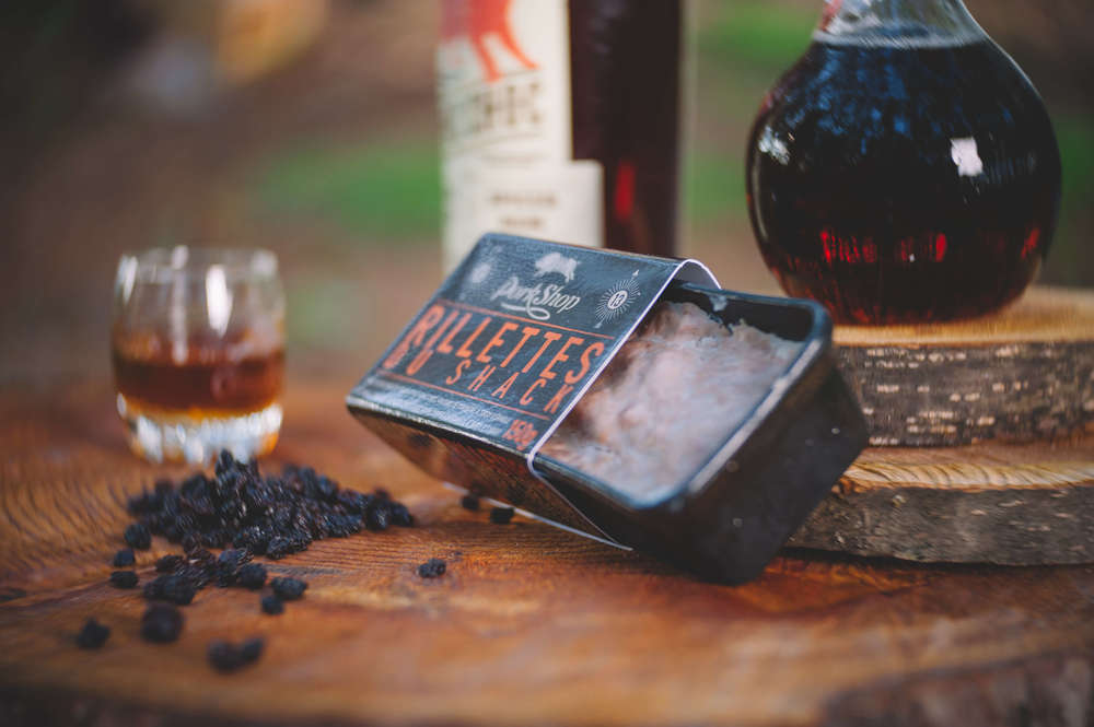 Nous invitons à la table également une portion de rillettes de porc. La fameuse maison Charcuterie Pork Shop, qui propose une série audacieuse et surtout délicieuse de saucissons, nous offre maintenant des rillettes cuites pendant 12 heures dans du gras de canard. Leur porc est certifié bien être animal, et leurs recettes sont toutes délectables. Nous choisissons ici pour vous les rillettes dites "du Shack", qui sont cuisinées avec le rhum Chic Chocs de la maison Pinnacle, ainsi qu'avec des raisins de corinthe. Charcuterie Pork Shop